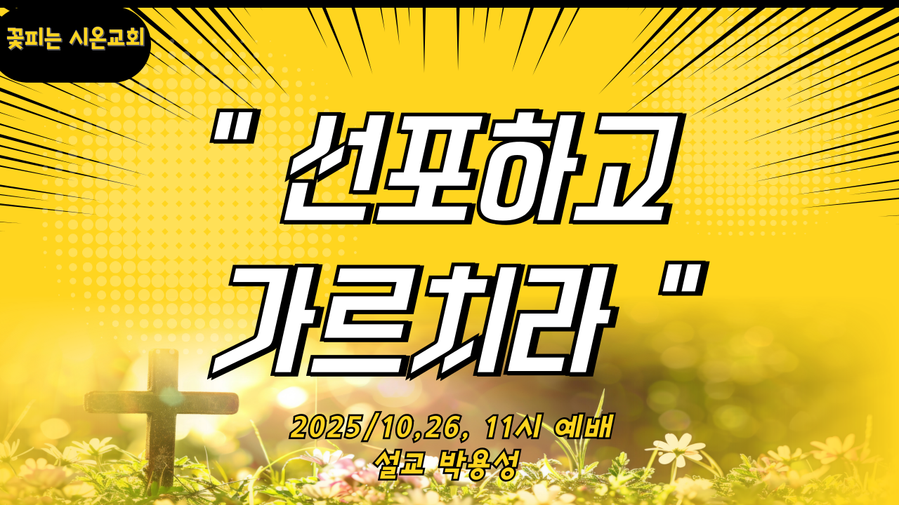 | 꽃피는 시온교회 11시 주일 예배 (" 말씀과 기도로 일어서자 " ) 2025/10,12, 설교 박용성 목사님 (0) | 2025.10.12 |
